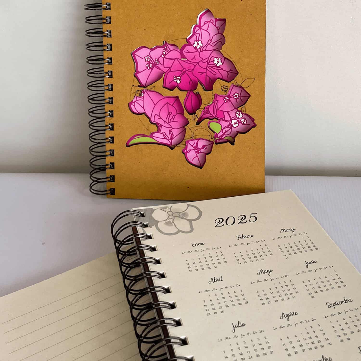 - Material: Tapa y contratapa MDF de 3mm barnizado | Tripa 100 hojas papel ecológico con rayas | Portada en cartulina impresa a color | Encuadernación con Anillo metálico.